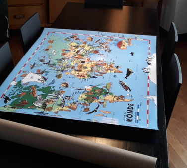 « Autour du MONDE » , est une carte du Monde de grand format pour enfants, qui est conçue comme un jeu de découvertes et de voyages.