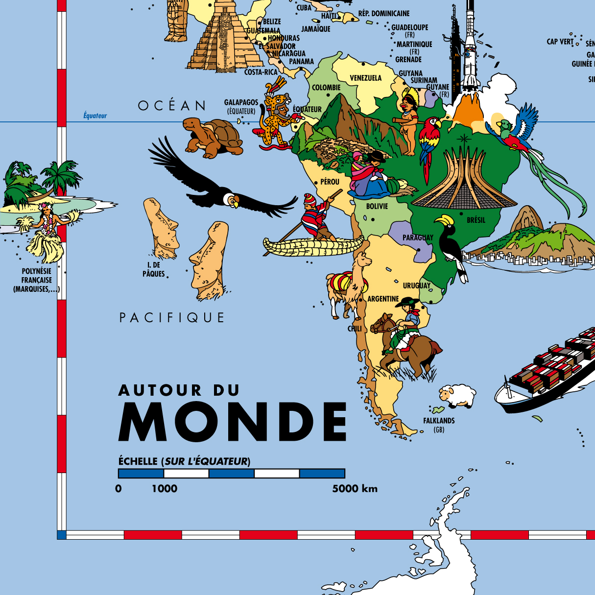 « Autour du MONDE » , est une carte du Monde de grand format pour enfants, qui est conçue comme un jeu de découvertes et de voyages.