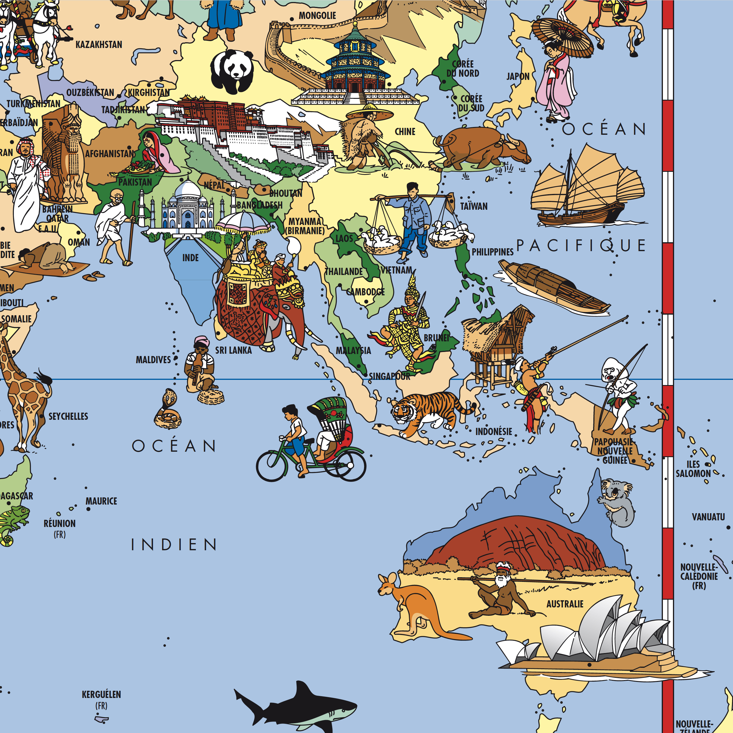 Pour décorer sa chambre, et pour le plaisir d’apprendre, les très nombreuses illustrations permettent à l’enfant de découvrir la géographie, les continents, les pays, les monuments, et les animaux du monde entier.