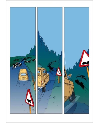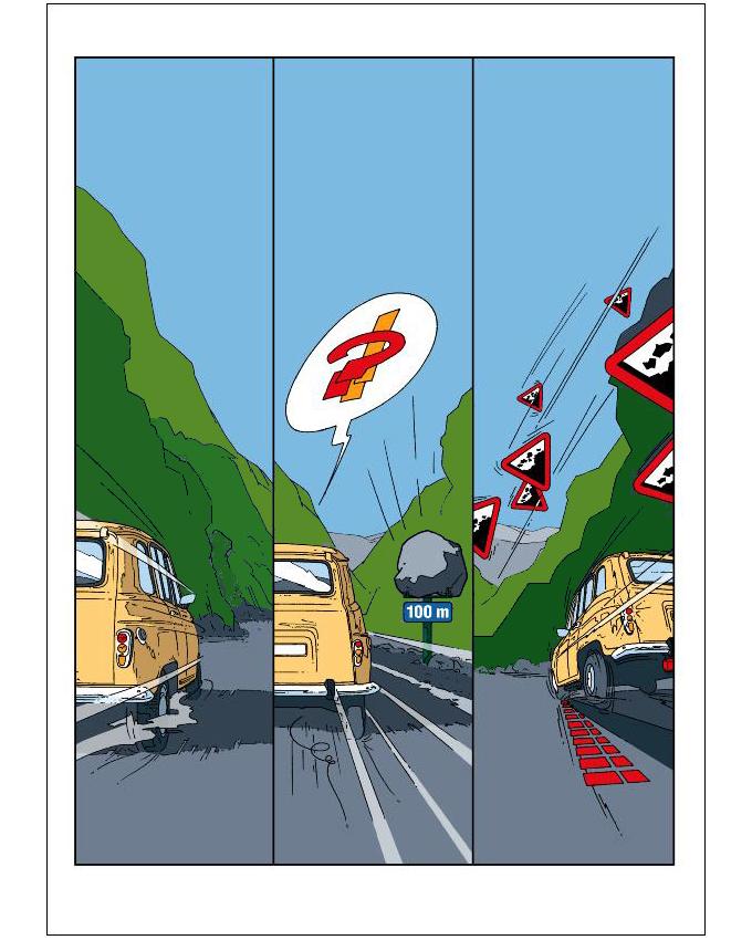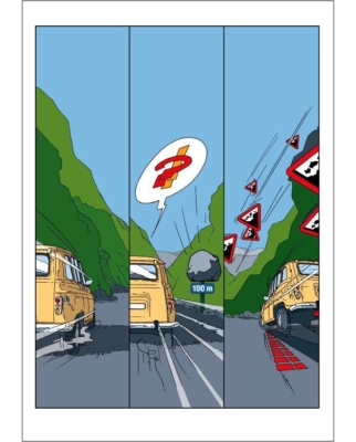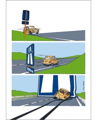 Série de gags en une planche qui mettent en scène les tribulations d'une Renault 4 dans l'univers des panneaux routiers.