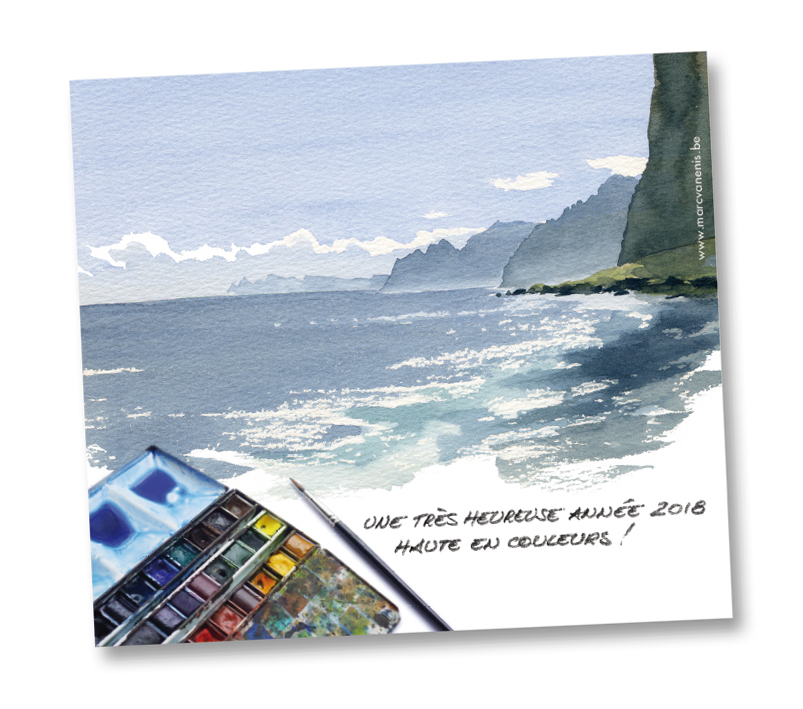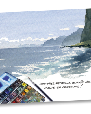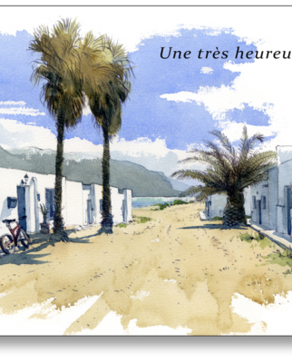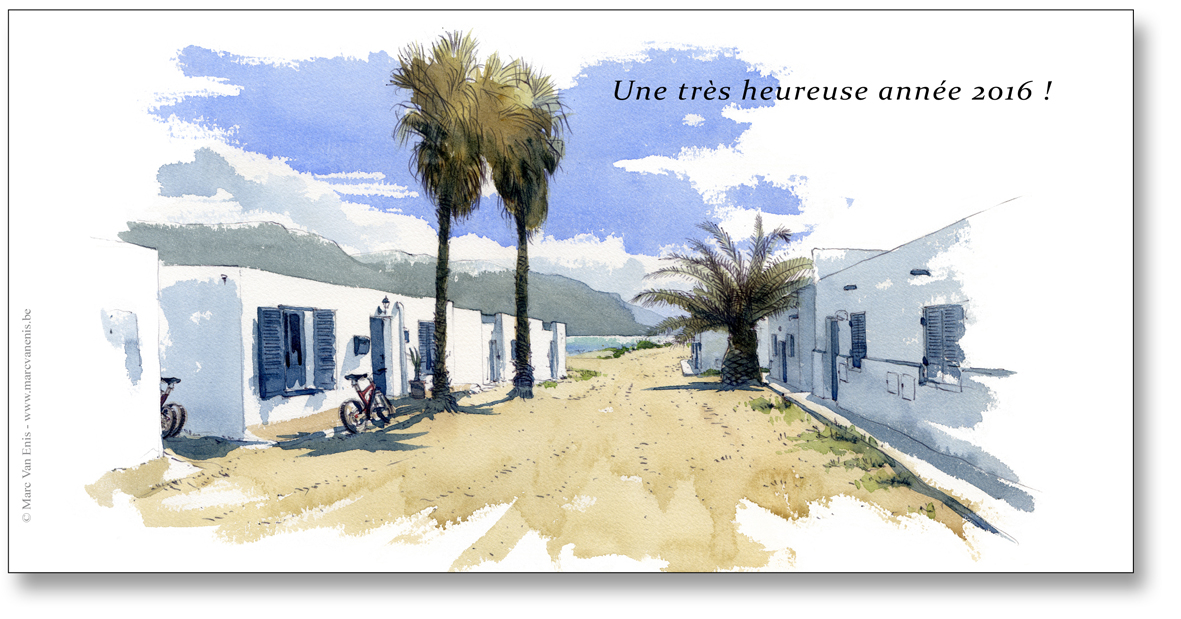Aquarelle à La Graciosa (Lanzarote), carte de voeux 2016Aquarelle originale extraite d'un carnet de voyage à La Graciosa (Caleta de Sebo), Lanzarote (îles Canaries), 2015